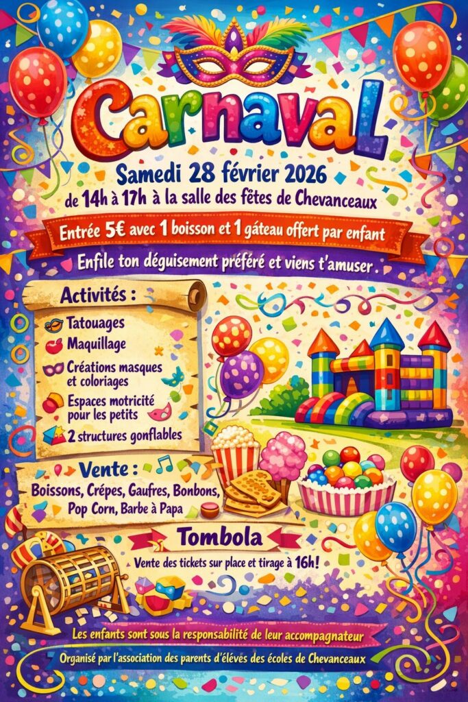 Samedi 28 février 2026, l’Association des Parents d’Élèves organise son Carnaval 🎉🎈à la salle des fêtes de Chevanceaux. Tu pourras t’amuser avec de nombreuses activités et te régaler avec plein de gourmandises 🍿📍🍬