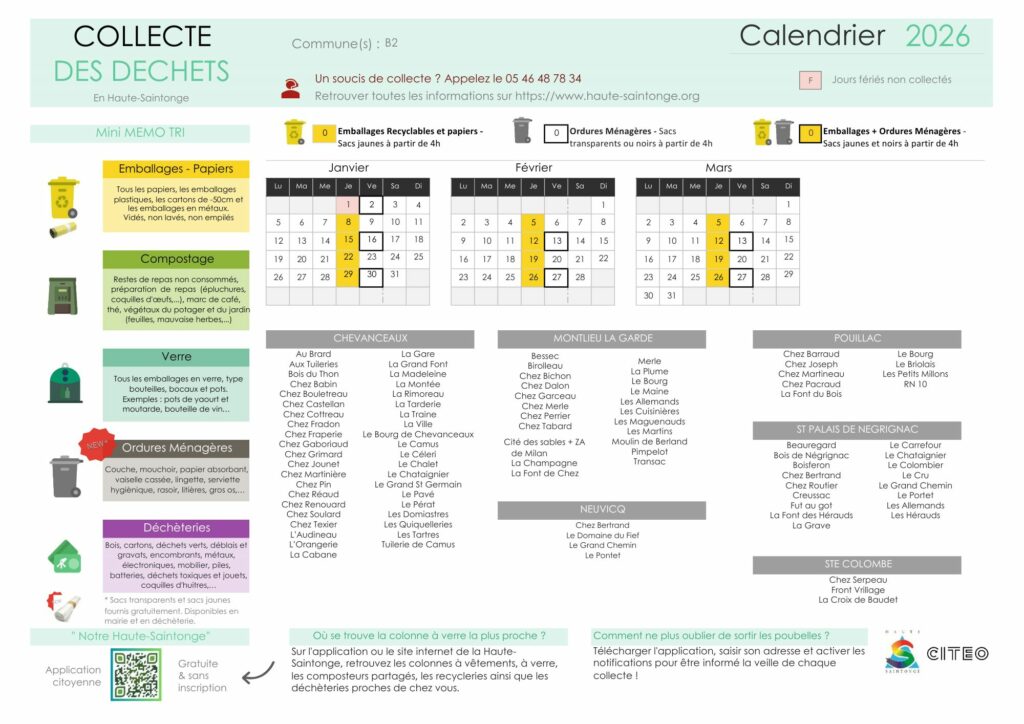 7 déchèteries accueillent les résidents du territoire de la Communauté des Communes de la Haute-Saintonge pour permettre de trier les encombrants et les déchets dangereux. Une convention a été signée avec CALITOM permettant aux haut-saintongeais d’utiliser les déchèteries de Baignes et de Châteaubernard.